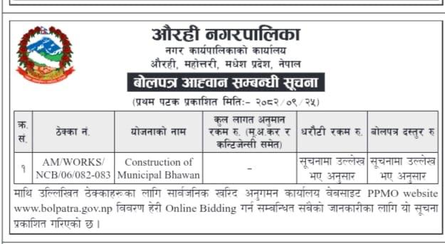 बोलपत्र आहवान सम्बन्धी सूचना। Construction of Municipal Bhawan