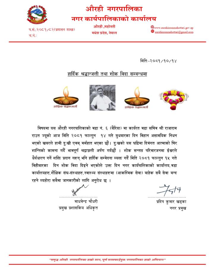 हार्दिक श्रद्धाञ्जली तथा शोक विदा सम्बन्धमा।