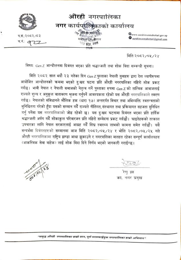 Gen Z आन्दोलनमा दिवंगत भएका प्रति श्रद्धान्जली तथा शोक बिदा सम्वन्धी सूचना।